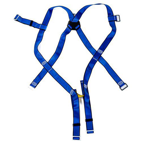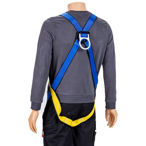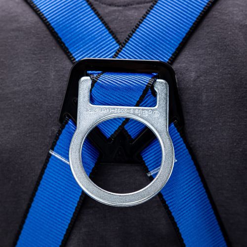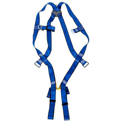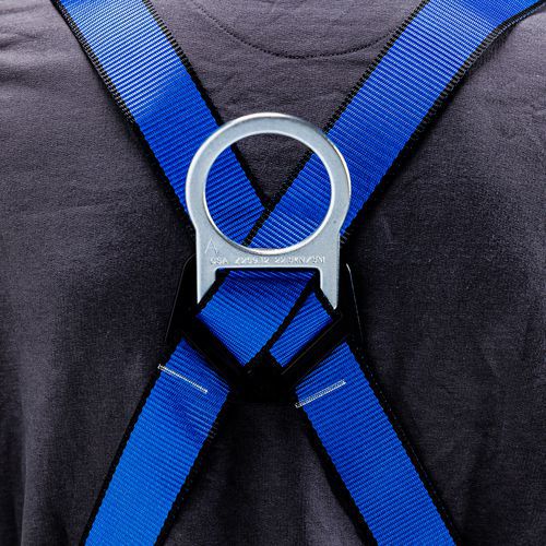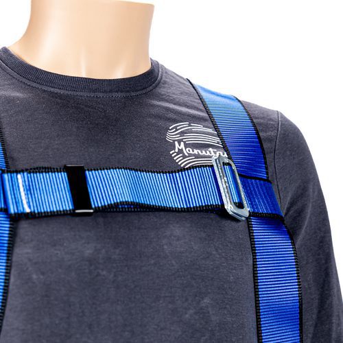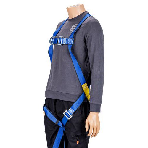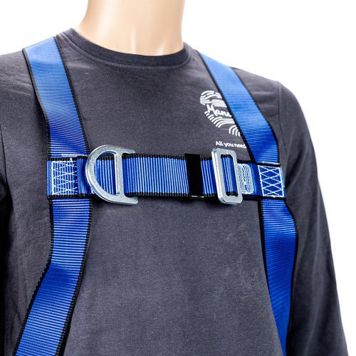 Pádový bezpečnostný postroj s dvoma kotevnými bodmi a tlmičom energie s certifikáciou CE pre úplnú istotu. Robustný vďaka pozinkovanému oceľovému kovaniu a vysokej odolnosti proti roztrhnutiu.
