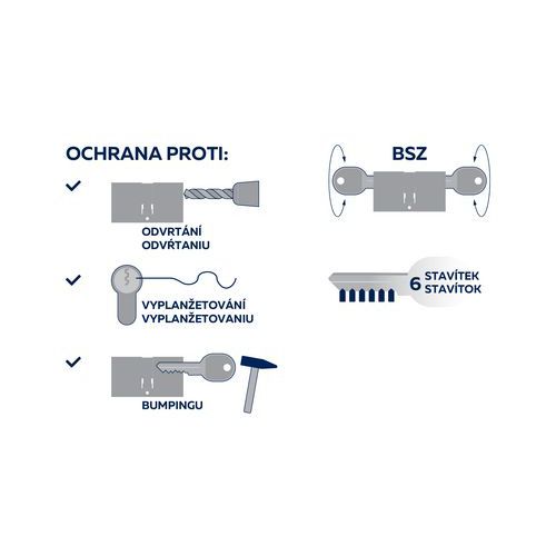 - Bezpečnostná 6-valčeková vložka s odolnosťou proti odvŕtaniu a nedeštruktívnej dynamickej metóde (tzv. bumping).