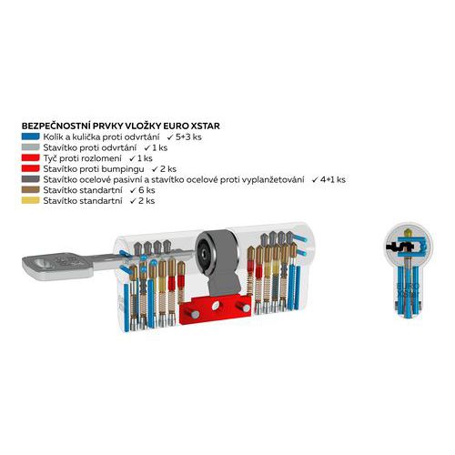 - Vysoká ochrana proti odvŕtaniu pomocou 9 prvkov z kalenej ocele, 5 kolíkov, 1 stavidlo a 3 guľky.