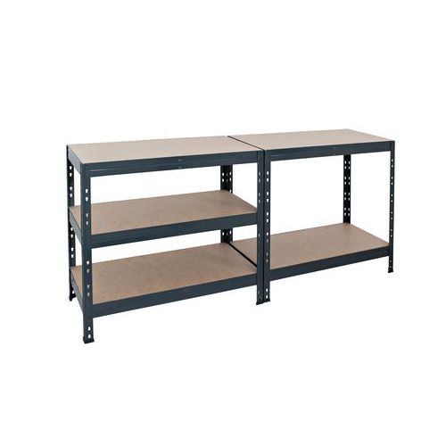 Bezskrutkové policové regály Manutan Expert Rapid 3 vhodné do kancelárií, dielní a skladov. Polica z kvalitnej drevovláknitej dosky s vysokou hustotou (HDF) je možné stavať v rastri 40 mm. Regály je možné spájať do zostáv pomocou spojovacích čapov. Ochranné plastové pätky. Konštrukcia z oceľového plechu hr. 1 – 1,5 mm. Povrchová úprava pozinkovaním alebo práškovým lakom. Regály je možné spájať do zostáv pomocou spojovacích čapov. Stojky sa skladajú z dvoch častí a regál tak je možné prestavať na dielenský stôl.