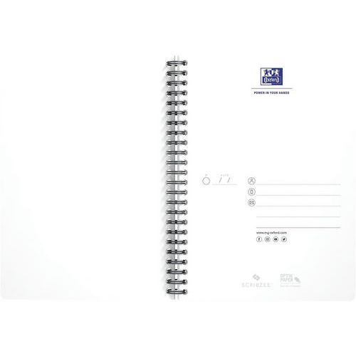 Zápisník Oxford s odnímateľným popisovačom stránok. Štvorčekové listy (5 x 5 mm) so záhlavím a dvojitým okrajom. Formát A5 – šírka: 14,8 cm x výška: 21 cm. Mäkký nepriehľadný obal. 180 strán - kvalitný papier Optik, 90 g extra biely hladký. Zápisník s certifikáciou EU Ecolabel.