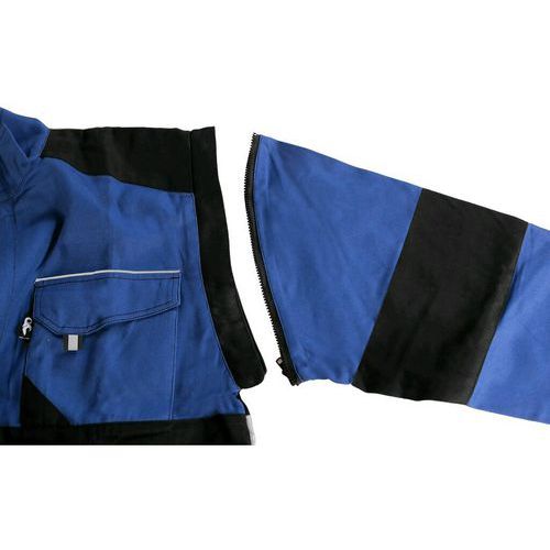 Panská kombinéza - skrátená verzia pre výšku 170-176 cm. Odopínateľné rukávy s elastickou manžetou, skryté zapínanie na zips a suchý zips, náprsné vrecká s chlopňami, skryté náprsné vrecko na zips, jednoduché bočné vrecká, elastická spodná časť bokov, ref. Veľkosť: 44-64 Materiál podšívky: 100% bavlna Reflexné doplnky: Áno Dĺžka výrobku: Krátka veľkosť 170-176 cm Farba: modrá