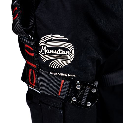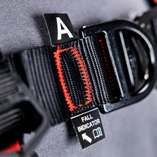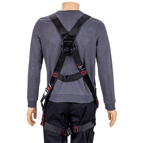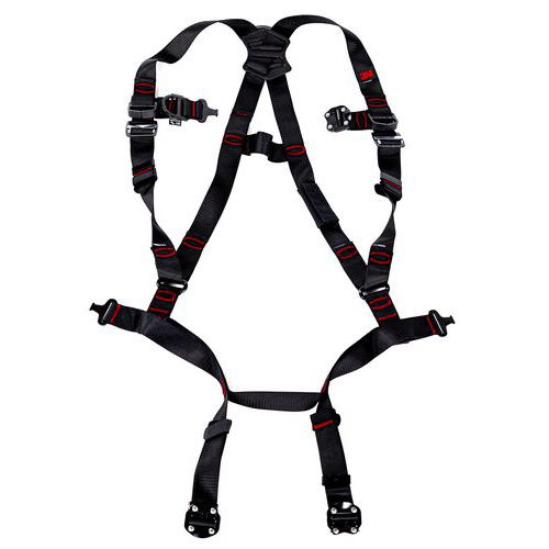 Štandardný pádový postroj s vodorovnými popruhmi na nohy a dvoma kotevnými bodmi. S prednými a zadnými indikátormi nárazu. Dva automaticky resetovateľné držiaky šnúrok. Konce popruhov s háčikmi a slučkami. Kryté štítky. Kĺbové krúžky.