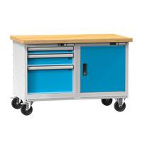 Jednoduchý mobilný pracovný stôl s doskou z bukovej škárovky. Stôl je vybavený jednou výškovo nastaviteľnou policou a držadlom pre ľahkú manipuláciu. Je osadený dvoma pevnými a dvoma otočnými kolieskami s brzdou z polypropylénu. Hrúbka dosky 40 mm.