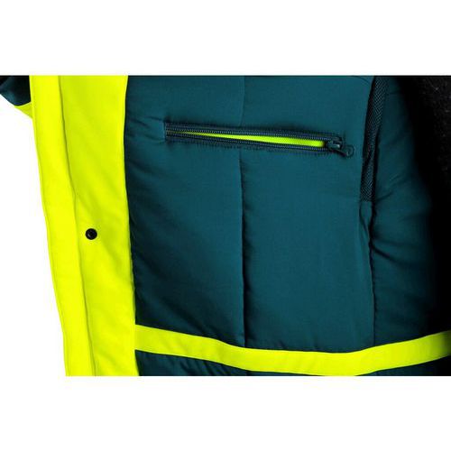 Pánska výstražná zateplená bunda s odopínacou kapucňou, odolná proti vode a vetru. Fleecový golier, vetranie v podpazuší, regulovateľné manžety na rukávoch, vnútorné manžety v rukávoch, kryté zapínanie na zips a cvoky, náprsné a bočné vrecká na zips, v pravom náprsnom vrecku dnímateľné puzdro na ID kartu, segmentované reflexné pásky, kontrastné HV sťahovanie v dolnom okraji, TPU membrána, odolnosť materiálu proti prieniku vody 8000 mm mimo oblasť švov, paropriepustnosť 5000 g/m2/24h. Odporúčané použitie: stavebníctvo, cestári, vodiči, letecká a lodná doprava, logistika, vodiči kamiónov, polícia. Sezóna: Zimná Vrchný materiál: 100% polyester Vodeodolnosť: 8 000 mm Paropriepustnosť: 5 000 g/m2/24hod TPU membrána: ÁNO Zateplenie: 100% polyester, 100 g/m2 Reflexné doplnky: Áno Veľkosť: S-3XL