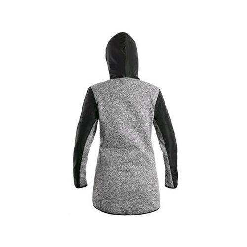- Dámska pletená bunda, predĺžená, kombinácia materiálov, pevná kapucňa, zapínanie na zips, rukávy s elastickými manžetami, 2 bočné vrecká.
