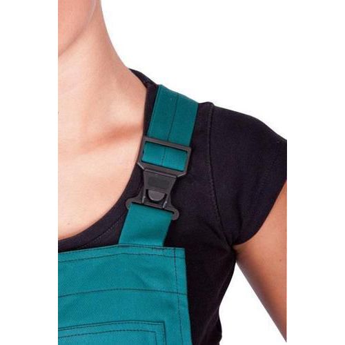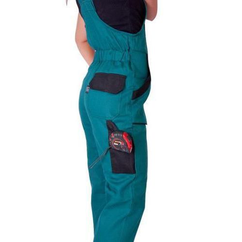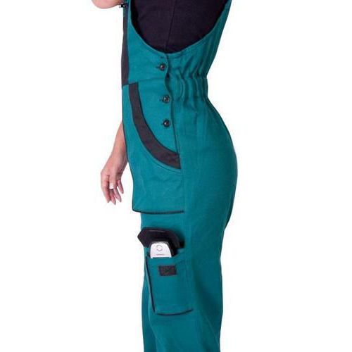 Zelené dámske montérky s náprsenkou s čiernymi doplnkami.