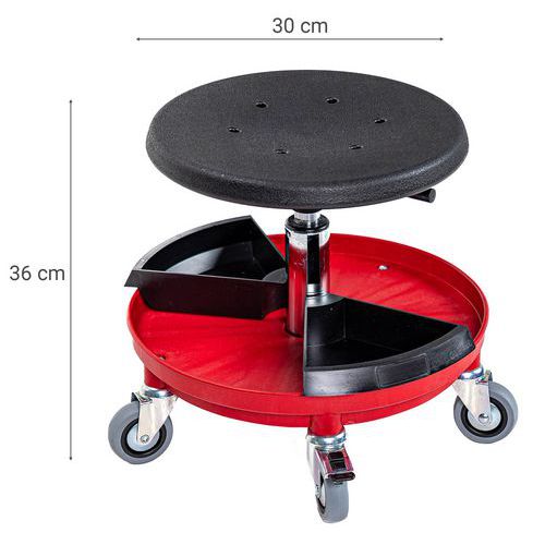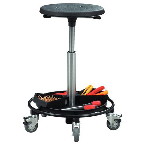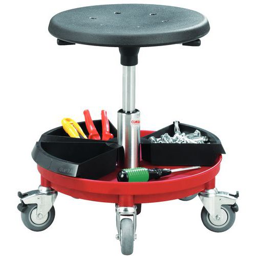 Mobilná montážna stolička pre prácu. Všetky náradie máte vždy po ruke v dvoch priehradkách na náradie. Ľahko nastavíte výšku sedenia. S 5 kolieskami, z toho 2 s brzdou. Nastavenie výšky sedacej plochy : áno Záruka výrobcu pre zákazníka : 3 roky