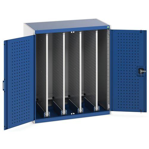 - Dielenské skrine so štyrmi výsuvnými obojstrannými perforovanými panelmi s plnovýsuvmi pre flexibilné zavesenie náradia.