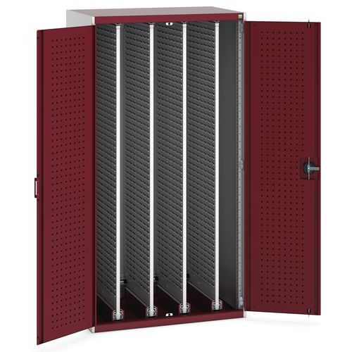 - Dielenské skrine so štyrmi výsuvnými obojstrannými perforovanými panelmi s plnovýsuvmi pre flexibilné zavesenie náradia.