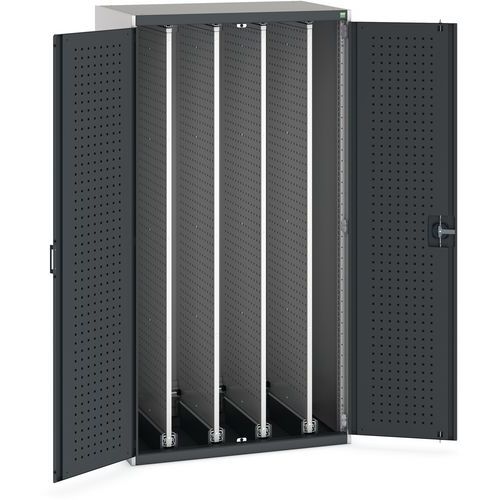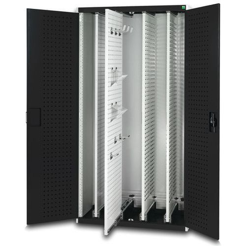 - Dielenské skrine so štyrmi výsuvnými obojstrannými perforovanými panelmi s plnovýsuvmi pre flexibilné zavesenie náradia.