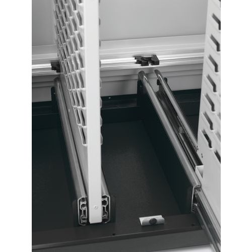 - Dielenské skrine so štyrmi výsuvnými obojstrannými perforovanými panelmi s plnovýsuvmi pre flexibilné zavesenie náradia.