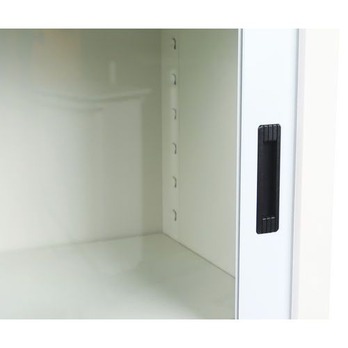 - Posuvné dvere s priezormi z tvrdeného skla šetria miesto a umožňujú okamžitý prehľad o obsahu skrine.