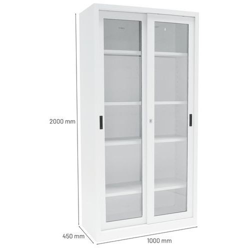 - Posuvné dvere s priezormi z tvrdeného skla šetria miesto a umožňujú okamžitý prehľad o obsahu skrine.