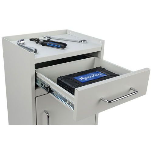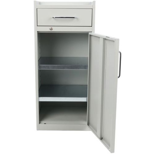 - Nízke dielenské skrinky obsahujú dve vyberateľné a výškovo nastaviteľné police. Skrinky sú vybavené hornou 3cm bezpečnostnou hranou.