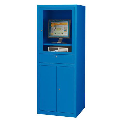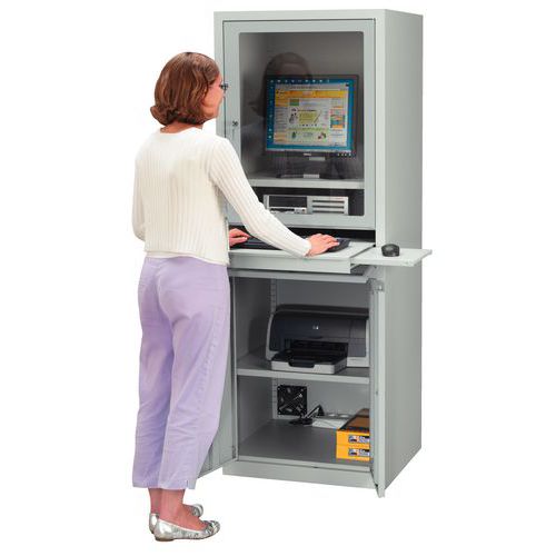 Chráňte svoj počítač v pevnej uzamykateľnej počítačovej skrini. Pracujte v dobrých podmienkach a umiestnite klávesnicu na výsuvnú policu. Poličku na myš je možné umiestniť na pravú alebo ľavú stranu. Celá skriňa je uzamykateľná jedným kľúčom. Dodáva sa vrátane ventilátora 9 W a napájacej lišty s piatimi zásuvkami. Max. zaťaženie police (kg) : 50 Max. zaťaženie (kg) : 300