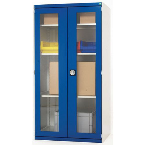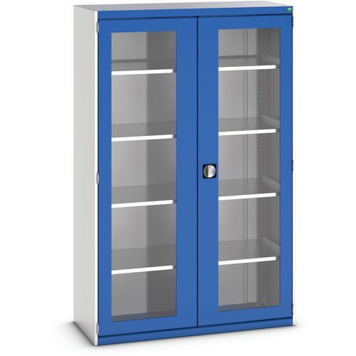 Dielenská skriňa s priehľadnými dverami Bott Cubio, 200 x 130 x 52,5 cm, 4 police, šedá-modrá