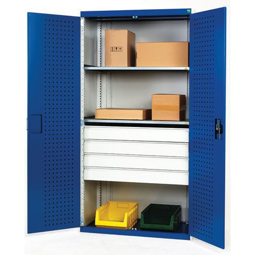- Vystužené krídlové dvere s perforovanou vnútornou stranou na uloženie náradia.
