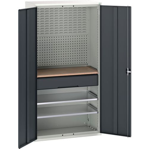 - Zadná stena je perforovaná na umiestnenie držiakov náradia a na zavesenie plastových boxov.