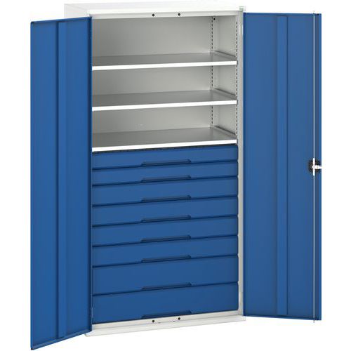 Dielenská skriňa so zásuvkami Bott Verso, 200 x 105 x 55 cm, 3 police, 8 zásuviek, šedá-modrá