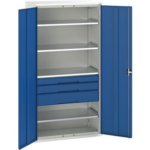 Dielenská skriňa so zásuvkami Bott Verso, 200 x 105 x 55 cm, 4 police, 3 zásuvky, šedá-modrá
