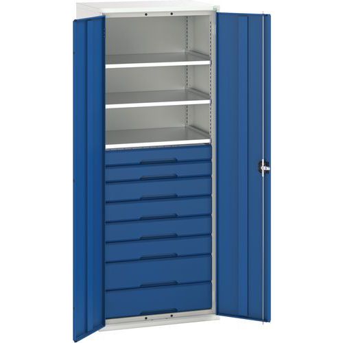 Dielenská skriňa so zásuvkami Bott Verso, 200 x 80 x 55 cm, 3 police, 8 zásuvky, šedá-modrá