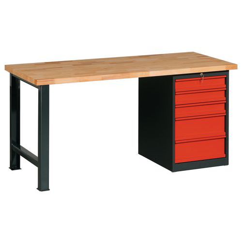 Stôl je stabilný a vyhovuje aj náročnejším pracovným úlohám vďaka robustnému vyhotoveniu podnožia, vyššej hmotnosti bukovej škárovky aj nahradením podnožia za kontajner.