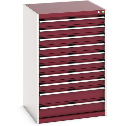 Zásuvkové skrine Bott Cubio so zásuvkami s nosnosťou 75 kg a 100% výsuvy na valčekových ložiskách. Robustná zváraná oceľová konštrukcia s nosnosťou až 1,5 tony, povrchová úprava práškovým lakom. Systém centrálneho zámku i blokácia otvorenia viacerých zásuviek naraz. s popisovateľnou lištou, uzamykanie cylindrickým zámkom s dvoma kľúčmi.