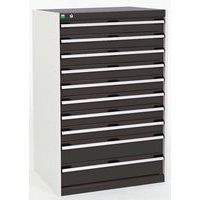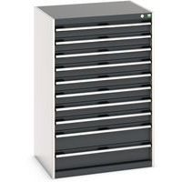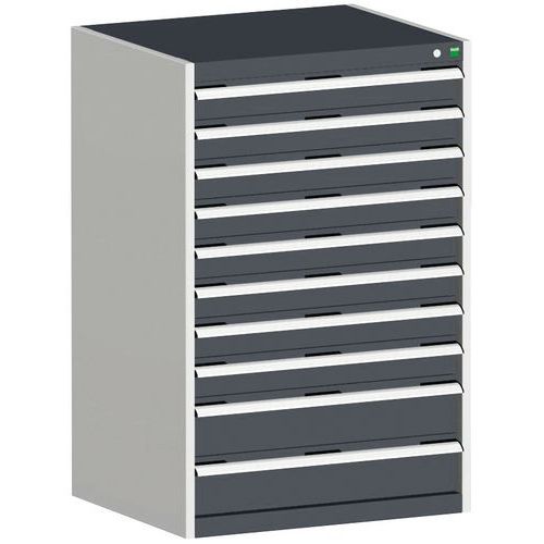 Zásuvkové skrine Bott Cubio so zásuvkami s nosnosťou 75 kg a 100% výsuvy na valčekových ložiskách. Robustná zváraná oceľová konštrukcia s nosnosťou až 1,5 tony, povrchová úprava práškovým lakom. Systém centrálneho zámku i blokácia otvorenia viacerých zásuviek naraz. s popisovateľnou lištou, uzamykanie cylindrickým zámkom s dvoma kľúčmi.
