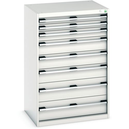 Zásuvkové skrine Bott Cubio so zásuvkami s nosnosťou 75 kg a 100% výsuvy na valčekových ložiskách. Robustná zváraná oceľová konštrukcia s nosnosťou až 1,5 tony, povrchová úprava práškovým lakom. Systém centrálneho zámku i blokácia otvorenia viacerých zásuviek naraz. s popisovateľnou lištou, uzamykanie cylindrickým zámkom s dvoma kľúčmi.