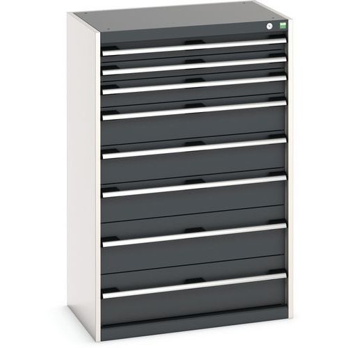 Zásuvkové skrine Bott Cubio so zásuvkami s nosnosťou 75 kg a 100% výsuvy na valčekových ložiskách. Robustná zváraná oceľová konštrukcia s nosnosťou až 1,5 tony, povrchová úprava práškovým lakom. Systém centrálneho zámku i blokácia otvorenia viacerých zásuviek naraz. s popisovateľnou lištou, uzamykanie cylindrickým zámkom s dvoma kľúčmi. Max. zaťaženie (kg) : 1500 kg