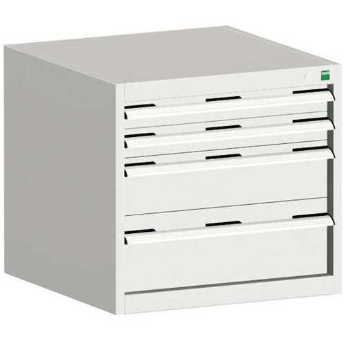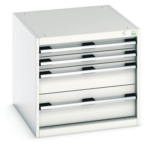 - Zásuvkové skrine Bott Cubio so zásuvkami s nosnosťou 75 kg a 100% výsuvy na valčekových ložiskách.