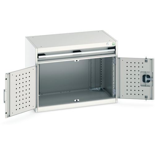 Zásuvkové skrine Bott Cubio so zásuvkami s nosnosťou 75 kg a 100% výsuvmi na valčekových ložiskách. zámku aj blokácia otvorenia viacerých zásuviek naraz. Ergonomické rukoväte s popisovateľnou lištou, uzamykanie cylindrickým zámkom s dvoma kľúčmi. Max. zaťaženie police (kg) : 75 kg Max. zaťaženie (kg) : 1500 kg