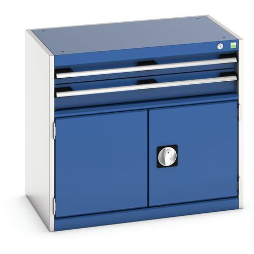 Zásuvkové skrine Bott Cubio so zásuvkami s nosnosťou 75 kg a 100% výsuvmi na valčekových ložiskách. zámku aj blokácia otvorenia viacerých zásuviek naraz. Ergonomické rukoväte s popisovateľnou lištou, uzamykanie cylindrickým zámkom s dvoma kľúčmi.