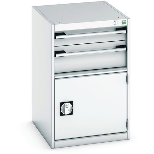 Zásuvkové skrine Bott Cubio so zásuvkami s nosnosťou 75 kg a 100% výsuvmi na valčekových ložiskách. zámku aj blokácia otvorenia viacerých zásuviek naraz. Ergonomické rukoväte s popisovateľnou lištou, uzamykanie cylindrickým zámkom s dvoma kľúčmi.