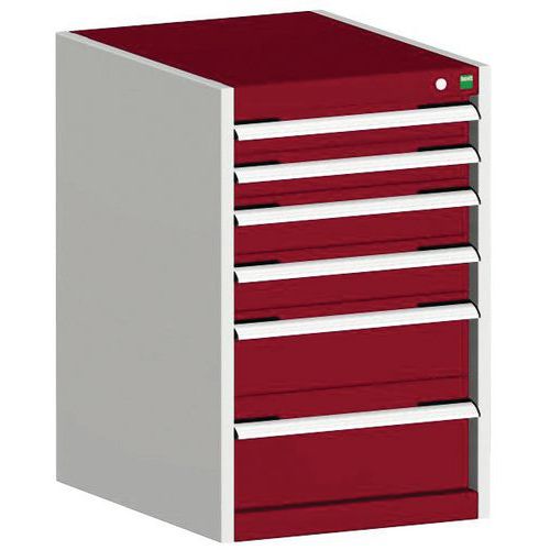 Zásuvkové skrine Bott Cubio so zásuvkami s nosnosťou 75 kg a 100% výsuvy na valčekových ložiskách. Robustná zváraná oceľová konštrukcia s nosnosťou až 1,5 tony, povrchová úprava práškovým lakom. Systém centrálneho zámku i blokácia otvorenia viacerých zásuviek naraz. s popisovateľnou lištou, uzamykanie cylindrickým zámkom s dvoma kľúčmi. Max. zaťaženie (kg) : 1500 kg