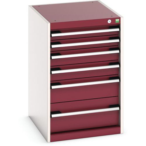 Zásuvkové skrine Bott Cubio so zásuvkami s nosnosťou 75 kg a 100% výsuvy na valčekových ložiskách. Robustná zváraná oceľová konštrukcia s nosnosťou až 1,5 tony, povrchová úprava práškovým lakom. Systém centrálneho zámku i blokácia otvorenia viacerých zásuviek naraz. s popisovateľnou lištou, uzamykanie cylindrickým zámkom s dvoma kľúčmi.