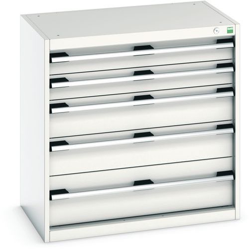 Zásuvkové skrine Bott Cubio so zásuvkami s nosnosťou 75 kg a 100% výsuvy na valčekových ložiskách. Robustná zváraná oceľová konštrukcia s nosnosťou až 1,5 tony, povrchová úprava práškovým lakom. Systém centrálneho zámku i blokácia otvorenia viacerých zásuviek naraz. s popisovateľnou lištou, uzamykanie cylindrickým zámkom s dvoma kľúčmi.
