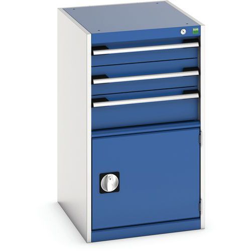 Zásuvkové skrine Bott Cubio so zásuvkami s nosnosťou 75 kg a 100% výsuvmi na valčekových ložiskách. zámku aj blokácia otvorenia viacerých zásuviek naraz. Ergonomické rukoväte s popisovateľnou lištou, uzamykanie cylindrickým zámkom s dvoma kľúčmi. Max. zaťaženie police (kg) : 75 kg Max. zaťaženie (kg) : 1500 kg