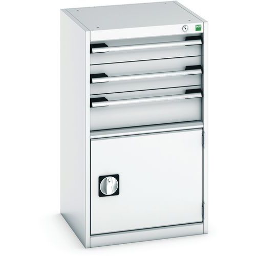 Zásuvkové skrine Bott Cubio so zásuvkami s nosnosťou 75 kg a 100% výsuvmi na valčekových ložiskách. zámku aj blokácia otvorenia viacerých zásuviek naraz. Ergonomické rukoväte s popisovateľnou lištou, uzamykanie cylindrickým zámkom s dvoma kľúčmi.