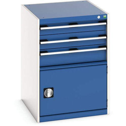 Zásuvkové skrine Bott Cubio so zásuvkami s nosnosťou 75 kg a 100% výsuvmi na valčekových ložiskách. zámku aj blokácia otvorenia viacerých zásuviek naraz. Ergonomické rukoväte s popisovateľnou lištou, uzamykanie cylindrickým zámkom s dvoma kľúčmi. Max. zaťaženie police (kg) : 75 kg Max. zaťaženie (kg) : 1500 kg
