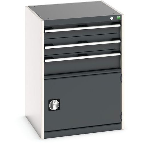 Zásuvkové skrine Bott Cubio so zásuvkami s nosnosťou 75 kg a 100% výsuvmi na valčekových ložiskách. zámku aj blokácia otvorenia viacerých zásuviek naraz. Ergonomické rukoväte s popisovateľnou lištou, uzamykanie cylindrickým zámkom s dvoma kľúčmi. Max. zaťaženie (kg) : 1500 kg Max. zaťaženie police (kg) : 75 kg