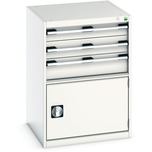 Zásuvkové skrine Bott Cubio so zásuvkami s nosnosťou 75 kg a 100% výsuvmi na valčekových ložiskách. zámku aj blokácia otvorenia viacerých zásuviek naraz. Ergonomické rukoväte s popisovateľnou lištou, uzamykanie cylindrickým zámkom s dvoma kľúčmi. Max. zaťaženie (kg) : 1500 kg Max. zaťaženie police (kg) : 75 kg