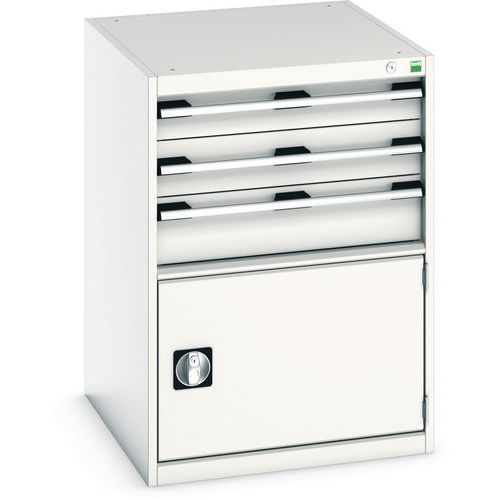 Zásuvkové skrine Bott Cubio so zásuvkami s nosnosťou 75 kg a 100% výsuvmi na valčekových ložiskách. zámku aj blokácia otvorenia viacerých zásuviek naraz. Ergonomické rukoväte s popisovateľnou lištou, uzamykanie cylindrickým zámkom s dvoma kľúčmi. Max. zaťaženie police (kg) : 75 kg Max. zaťaženie (kg) : 1500 kg