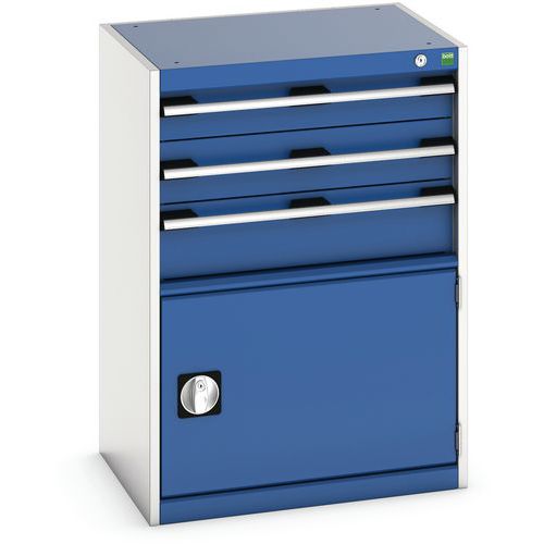 Zásuvkové skrine Bott Cubio so zásuvkami s nosnosťou 75 kg a 100% výsuvmi na valčekových ložiskách. zámku aj blokácia otvorenia viacerých zásuviek naraz. Ergonomické rukoväte s popisovateľnou lištou, uzamykanie cylindrickým zámkom s dvoma kľúčmi. Max. zaťaženie police (kg) : 75 kg Max. zaťaženie (kg) : 1500 kg