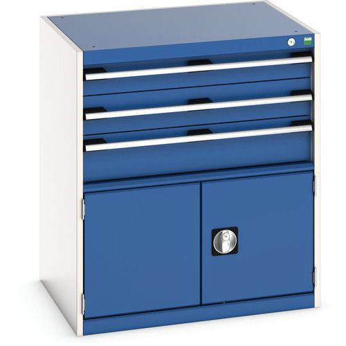 Zásuvkové skrine Bott Cubio so zásuvkami s nosnosťou 75 kg a 100% výsuvmi na valčekových ložiskách. zámku aj blokácia otvorenia viacerých zásuviek naraz. Ergonomické rukoväte s popisovateľnou lištou, uzamykanie cylindrickým zámkom s dvoma kľúčmi. Max. zaťaženie police (kg) : 75 kg Max. zaťaženie (kg) : 1500 kg