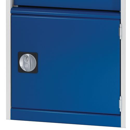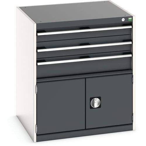 Zásuvkové skrine Bott Cubio so zásuvkami s nosnosťou 75 kg a 100% výsuvmi na valčekových ložiskách. zámku aj blokácia otvorenia viacerých zásuviek naraz. Ergonomické rukoväte s popisovateľnou lištou, uzamykanie cylindrickým zámkom s dvoma kľúčmi. Max. zaťaženie police (kg) : 75 kg Max. zaťaženie (kg) : 1500 kg