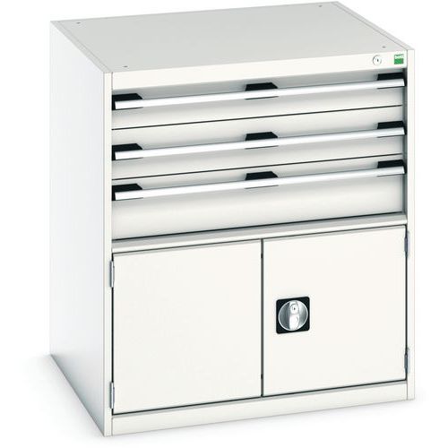 Zásuvkové skrine Bott Cubio so zásuvkami s nosnosťou 75 kg a 100% výsuvmi na valčekových ložiskách. zámku aj blokácia otvorenia viacerých zásuviek naraz. Ergonomické rukoväte s popisovateľnou lištou, uzamykanie cylindrickým zámkom s dvoma kľúčmi. Max. zaťaženie police (kg) : 75 kg Max. zaťaženie (kg) : 1500 kg
