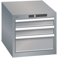 Dielenské zásuvkové skrine Lista, 3 alebo 4 zásuvky. Zamykanie kľúčom. Optimálne využitie vďaka plnému výsuvu a optimálnej výške čela zásuviek. Vynikajúca ochrana proti prachu, kvapalinám a mechanickému opotrebovaniu vďaka uzavretému rámu s povrchom odolným proti nárazom a oderu. Systém proti prevráteniu, ktorý zabraňuje pádu zásuvky, a individuálne zamykanie zásuviek. Ochrana proti korózii elektroforetickým imerzným lakovaním a striekaním. Optimalizované úložné priestory a organizácie vďaka deliacemu materiálu LISTA prispôsobenému každému použitiu a zásuvkám vybaveným drážkami a perforáciami. Profesionálne popisovanie s popisovacím softvérom LISTA Script a výklopnou úchytkou na vkladanie štítkov. Dokonale tichý pohyb vďaka sane bez priečnika Deliaci materiál do zásuviek nie je súčasťou dodávky. Nutné dokúpiť zvlášť. Max. zaťaženie (kg) : 75 kg
