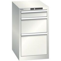 Dielenské zásuvkové skrine Lista, 3 alebo 5 zásuviek. Zámok na kľúč. Optimálne využitie vďaka plnému výsuvu a optimálnej výške čela zásuviek. Vynikajúca ochrana proti prachu, kvapalinám a mechanickému opotrebovaniu vďaka uzavretému rámu s povrchom odolným proti nárazom a oderu. Systém proti prevráteniu, ktorý zabraňuje pádu zásuvky, a individuálne zamykanie zásuviek. Ochrana proti korózii elektroforetickým imerzným lakovaním a striekaním. Optimalizované úložné priestory a organizácie vďaka deliacemu materiálu LISTA prispôsobenému každému použitiu a zásuvkám vybaveným drážkami a perforáciami. Profesionálne popisovanie s popisovacím softvérom LISTA Script a výklopnou úchytkou na vkladanie štítkov. Dokonale tichý pohyb vďaka sane bez priečnika. Deliaci materiál do zásuviek nie je súčasťou dodávky. Nutné dokúpiť zvlášť.